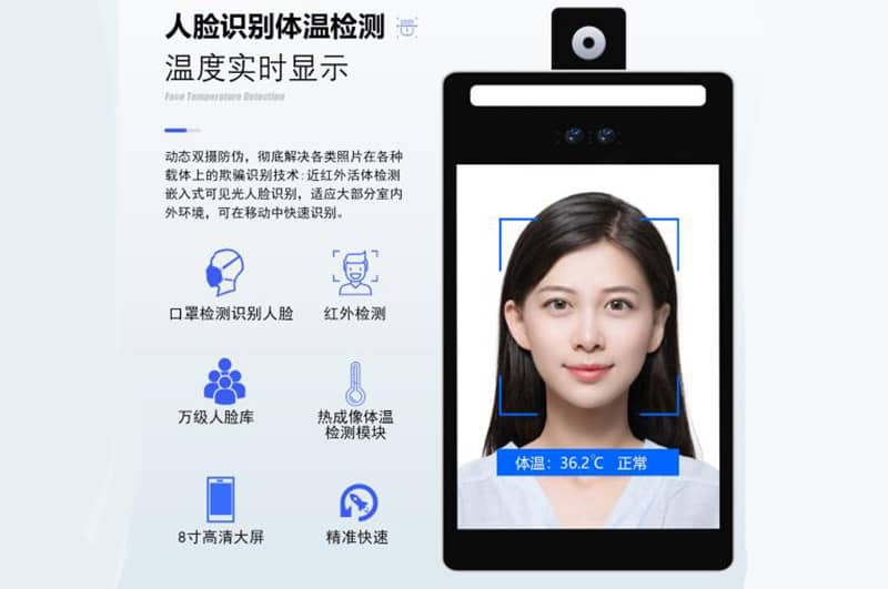 公交车安装人脸识别体温监测仪,固定安装,安装完毕后,乘客依次识别人证比对识别的同时进行体温检测,识别成功后,将自动记录个人体温,人体测温的数据会自动通过网络上传到疫情健康平台进行存储,单位可以第一时间发现体温过高人员。